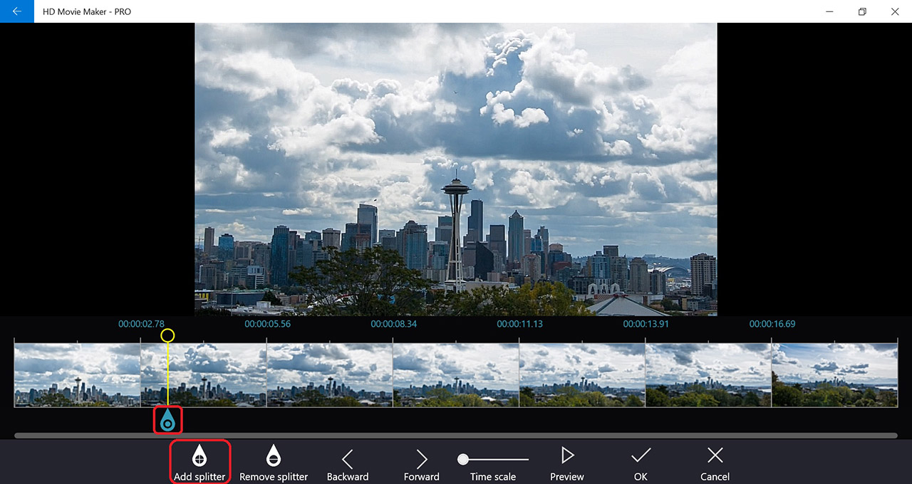 - Press Add splitter. A splitter (splitter marks where the video is split) will be added at the cursor position.