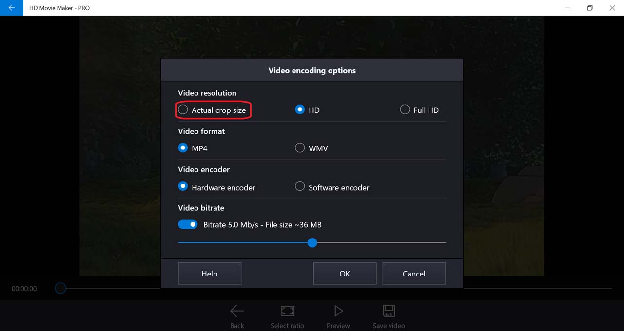 One thing to note is that if the ratio of the crop frame is not 16:9, when choosing Full HD resolution or HD720 resolution, black borders may appear on the sides of the video. To avoid this, choose Actual crop size while changing output movie settings.