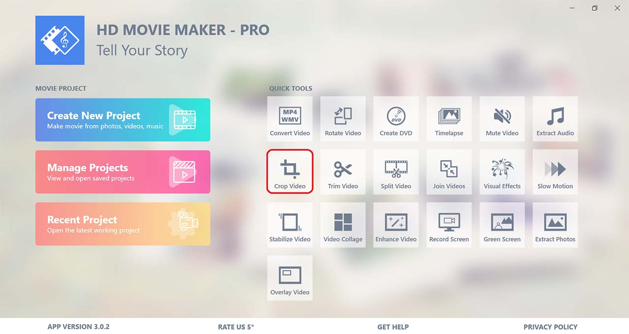 To open the tool, select Crop Video in the Quick Tools section