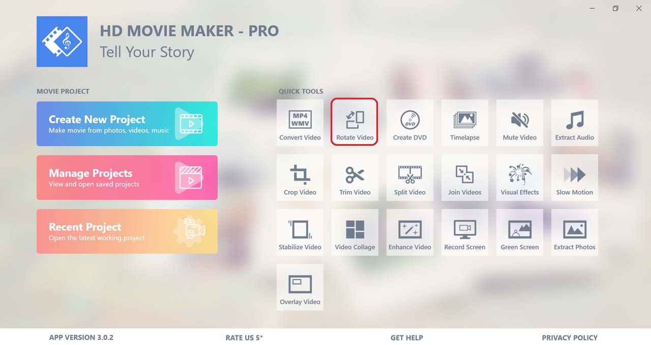 To open the tool, select Rotate Video in the Quick Tools section.