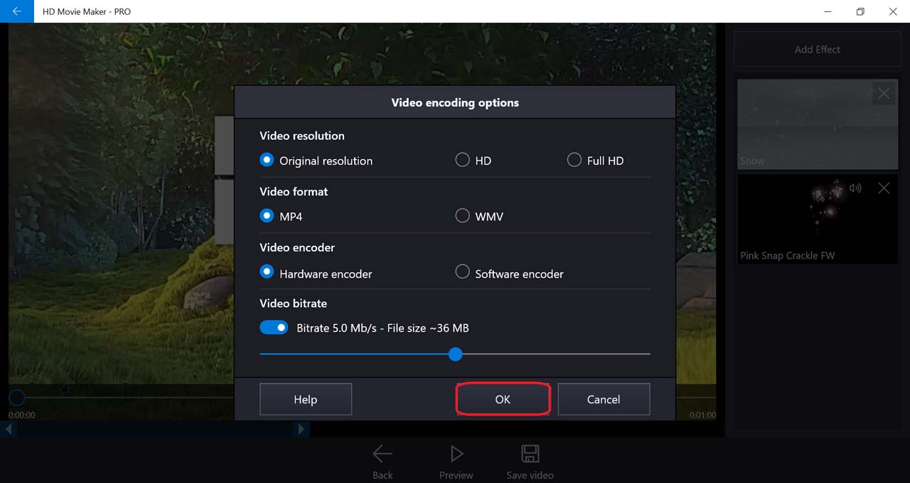 To add an effect, select Add Effect, then choose the effect you want. HD Moive Maker provides over 15 effects for you to choose from. You can add multiple effects to your video.